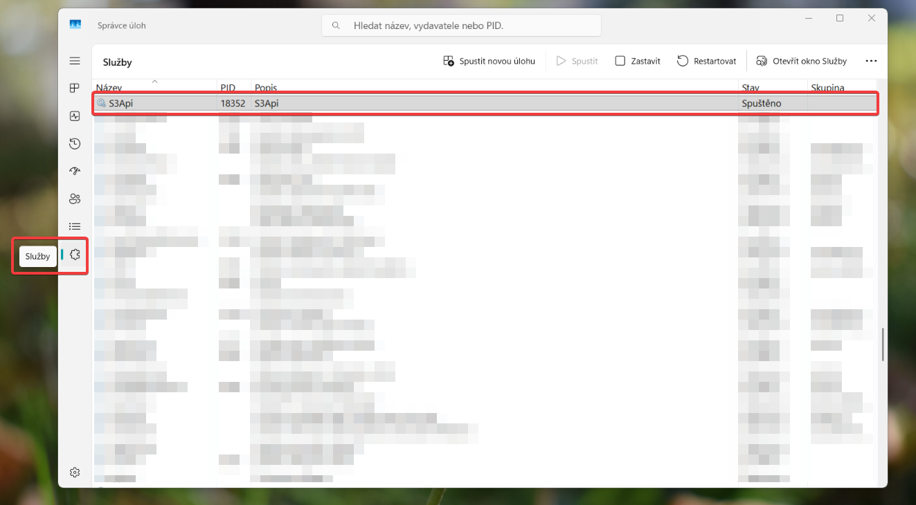 • V správcovi úloh vyberte ikonu služby a nájdete službu S3Api.