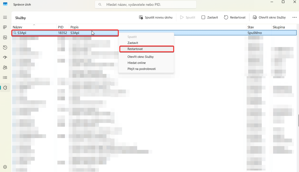 • Na službu S3Api kliknete pravým tlačidlom myši – Reštartovať.