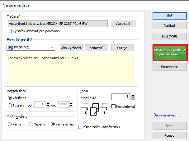 4. V okne Nastavenie tlače zvoľte Elektronické podanie pre Fin. správu. Zobrazí sa ponuka, kde vyberáte akým spôsobom sa export odošle.