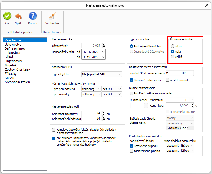 1. V prvom kroku skontrolujeme nastavenie typu účtovnej jednotky cez Money/Možnosti a nastavenia/ Nastavenie účtovného roka. Nastavíme typ účtovnej jednotky podľa vyššie uvedených kritérií.