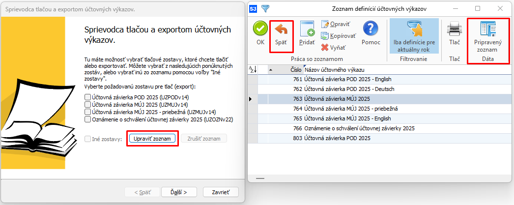 3. Zoznam ponúkaných tlačív by mal byť ponúkaný vždy pre aktuálny rok. Jeho aktuálnosť zabezpečuje Synchronizácia po inštalácií novej verzie. Ak ju náhodou máte vypnutú tak volíme tlačidlo Upraviť zoznam a v novo otvorenom okne tlačidlo Pripravený zoznam. Do výberu výkazov sa vrátime tlačidlom Späť.