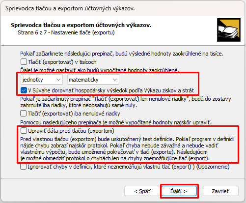 6. Na strane 6/8 nastavíme zaokrúhľovanie na jednotky a tiež odporúčame zaškrtnúť možnosť V Súvahe dorovnať hospodársky výsledok podľa Výkazu ziskov a strát, Kombináciou tlačidiel Ďalší a Dokončiť sprievodcu ukončíme. Ak sme podľa odporúčania zvolili možnosť Upraviť dáta pred tlačou (exportom), tak sa nám zobrazí aj okno kde vieme upraviť hodnoty napočítané programom.