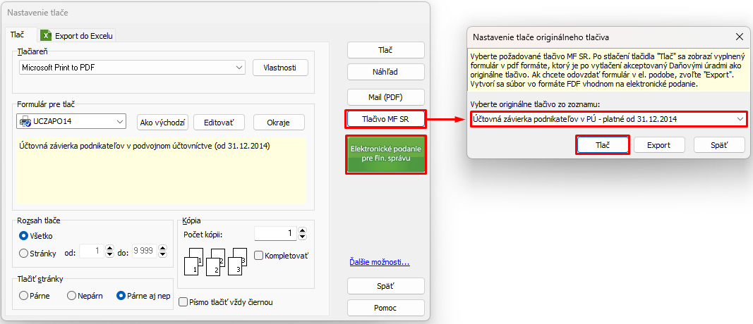 7. V okne Nastavenie tlače môžeme tlačidlom Tlač (resp. Náhľad) vytlačiť (zobraziť) Účtovnú závierku. Tlačidlom Tlačivo MFSR a voľbou príslušného tlačiva z roletovej ponuky potvrdením tlačidlom Tlač vyexportujeme zostavu do oficiálneho tlačiva MFSR. A nakoniec tlačidlom Elektronické podanie pre Fin. správu vyexportujeme tlačivo na portál eDane resp. do súboru podateľného na portáloch Finančnej správy.