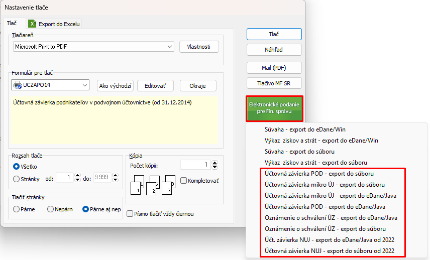 8. Pri exporte tlačiva na portál eDane resp. do súboru podateľného na portáloch Finančnej správy tlačidlom Elektronické podanie pre Fin. správu si môžeme vybrať z viacerých ponúk dve možnosti Účtovná závierka POD/MÚJ/NÚJ – export do súboru (pre tvorbu súboru vhodného na import na portál https://financnasprava.sk) a Účtovná závierka POD/MÚJ/NÚJ – export do eDane/Java (pre priamy export na portál eDane).