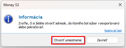 a) zvolíme Účtovná závierka POD/MÚJ/NÚJ – export do súboru a vyexportuje sa XML súbor vhodný na import na portáloch Finančnej správy. Súbor sa uloží do adresára PRINT vo Vašej inštalácii Money S3 (štandardne C:/Users/Public/Documents/CIGLER SOFTWARE/Money S3/PRINT). Po exporte sa ponúkne možnosť Otvoriť umiestnenie, ktorá otvorí adresár s vyexportovaným súborom. Takto vyexportovaný súbor vieme ručne načítať na portál financnasprava.sk alebo do aplikácie eDane/Java, ak ju používame na inom počítači.
