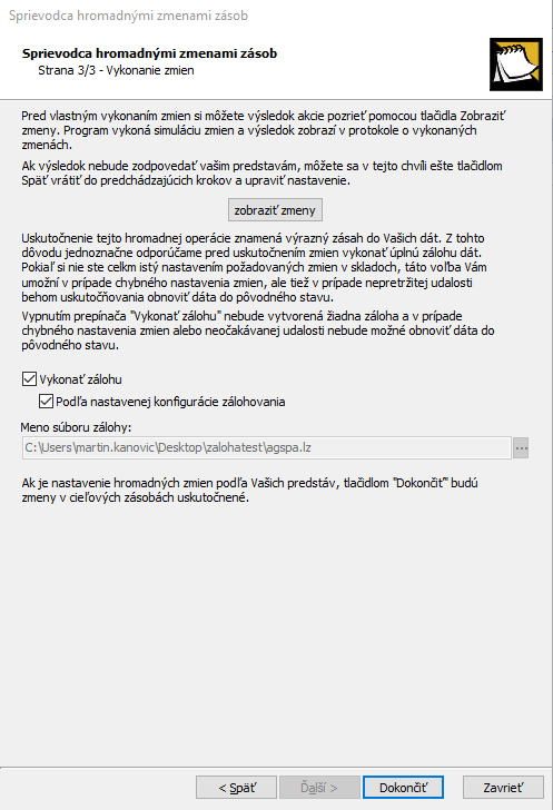 - Potvrdením tlačidla Ďalší sa otvorí okno s možnosťou Zobraziť zmeny a nastavenie vytvorenia zálohy.