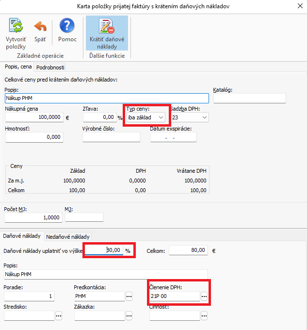 Opäť použite funkciu Krátiť daňové náklady a vytvorte položky pre odpočítateľnú a neodpočítateľnú DPH v pomere 50:50. POZOR: na položke daňové náklady, upravte hodnotu na 50%.