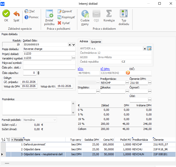 b) k faktúre vytvoríme Interný doklad pre Reverse Charge - s položkami pre daňovú povinnosť aj pre odpočítanie dane