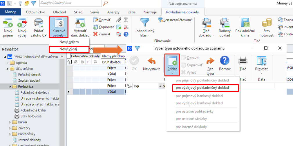 Precenenie bankových účtov a pokladníc vykonáte v starom roku cez Účtovníctvo / Pokladnica resp. Účtovníctvo / Banka voľbami Kurzové rozdiely / Nový príjem resp. Nový výdaj. Program Vás vyzve na výber typu dokladu zvoleného druhu dokladu. Ak typ pre kurzový rozdiel ešte nemáme vytvorený, tak si ho vytvoríme tlačidlom Pridať. Na type nastavíme hlavne v záložke Podrobnosti pole Pokladnica resp. Banka, ostatné polia voliteľne a je ich možné doplniť priamo pri vystavení dokladu kurzového rozdielu. Následne po výberu typu sa otvorí Karta dokladu, kde doplníme sumu kurzového rozdielu a doklad uložíme. Doklady kurzového rozdielu sú označené ikonou.