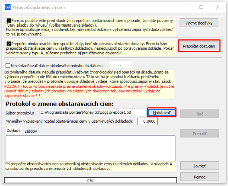 Prepočet hodnoty skladu vykonáme cez Sklad / Hrom. operácie / Prepočet obstarávacích cien (vykoná sa prepočet na všetkých skladoch na všetkých zásobách). Otvorí sa okno Prepočet obstarávacích cien, kde tlačidlom Nalistovať nastavíme meno a umiestnenie protokolu o prepočte (je na nás kde a pod akým názvom ho uložíme). Tlačidlom Prepočet obst. cien spustíme samotný prepočet, ktorý prejde všetky výdajové doklady a zreálni obstarávacie ceny na nich a tým pádom aj výslednú hodnotu skladu.