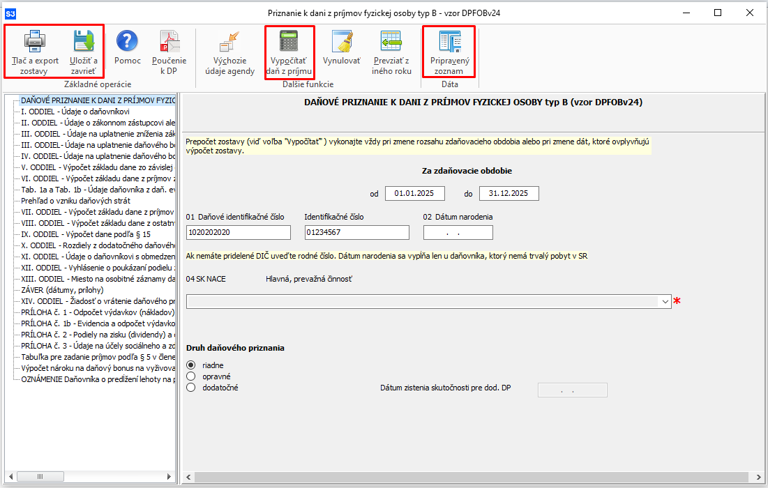 Otvorí sa mi okno Priznania k dani z príjmov, kde na začiatku vypĺňania odporúčame zvoliť tlačidlo Pripravený zoznam (potiahne aktuálnu definíciu zostavy) a následne Vypočítať daň z príjmu (potiahne údaje z účtovníctva a doplní ich do zostavy). Postupne prechádzame časti Priznania v ľavej časti a dopĺňame alebo editujeme hodnoty tak, aby Priznanie bolo vyplnené korektne. Ak chceme Priznanie uložiť a pokračovať v práci neskôr, volíme tlačidlo Uložiť a zavrieť. Tlačidlom Tlač a export zostavy zostavu vytlačíme a vyexportujeme pre účely podania do aplikácie eDane/Java alebo na portál Finančnej správy.