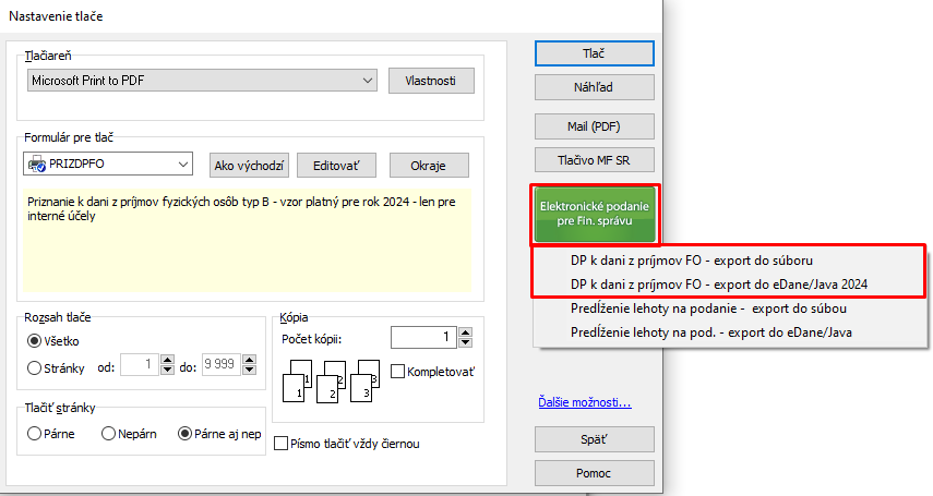 V okne Nastavenie tlače zostavu vyexportujeme tlačidlom Elektronické podanie pre Fin. správu, kde vieme zvoliť export do súboru alebo export do eDane/Java.