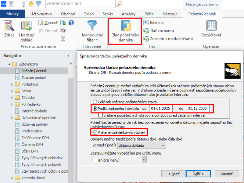 Po skontrolovaní účtovníctva, podaní Priznania k dani z príjmov a zaúčtovaní splatnej dane môžeme vytlačiť Peňažný denník. Peňažný denník vytlačíme v starom roku cez Účtovníctvo / Peňažný denník / Tlač peňažného denníka. Otvorí sa Sprievodca tlačou peňažného denníka, kde na strane 2/5 zvolíme interval 01.01. – 31.12. a zaklikneme možnosť vrátane počiatočných stavov a Vrátane uzávierkových úprav. Na strane 4/5 zvolíme možnosť Plný tvar Peňažného denníka a zaklikneme Záverečný prehľad.